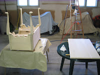 I prep my garage, which has now temporarily become the spray room. Today Michigan's fall weather has cooled the air to about 40 degrees. Better get that portable heater going. Water-based finishes flow better in 60 to 70 degree temperatures, 70 is the optimum. I know, I know, its only the wash-coat, so temperature isn't too critical. Flowing out a wash-coat isn't the goal. Getting the wash-coat to soak into the wood is!
