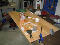 Lets Get StartedI’ll take the finish off using a chemical stripper. I like thick rubber gloves, because the steel wool will chew through most regular "finishing" rubber gloves. Not pictured are my safety goggles. Always wear safety goggles for splashes and from those vapors which can sting the eyes. Work in a well-ventilated area or best outdoors. I apply the stripper with a natural hair paintbrush. Let is sit on the surface till the old finish has mostly lifted and bubbled up. I then remove the heavy layer of goo with a large putty-knife wiping it into paper towels. Then I'll go back over the area applying more stripper...let it sit on the surface a few minutes and while the surface is still wet, scrub the surface in the direction of the grain removing finish that remains down in the pores of the wood. Your steel wool will be come full of removed finish just like a sponge soaking up water.